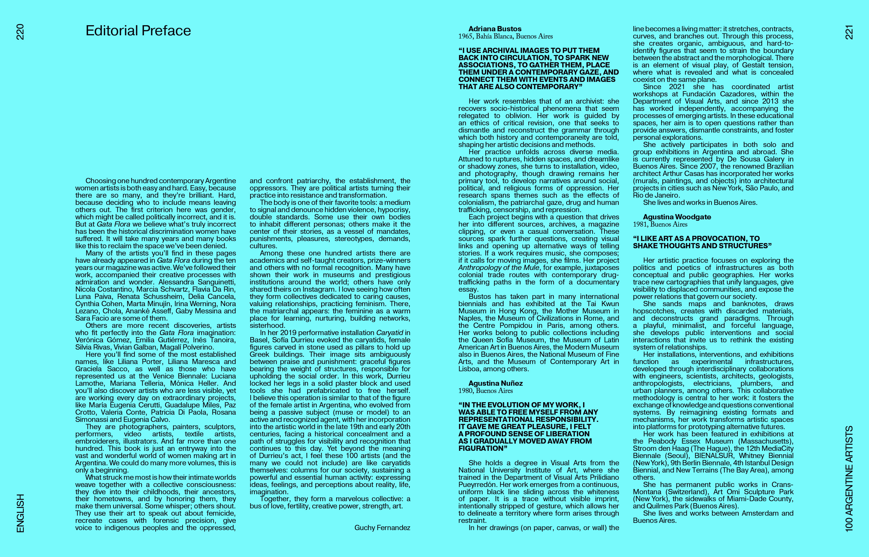 Elegir 100 artistas contemporáneas argentinas es tan difícil como fácil. Son muchas y muy buenas, pero cuesta decidir. El criterio aquí fue primero por género, lo que puede tacharse de políticamente incorrecto, y ciertamente lo es, pero ocurre que, respecto de esta cuestión, Gata Flora cree que lo incorrecto fue la discriminación histórica que hemos sufrido las mujeres. Faltan muchos años y muchos libros como este para ocupar el espacio que se nos ha negado en todos los ámbitos.