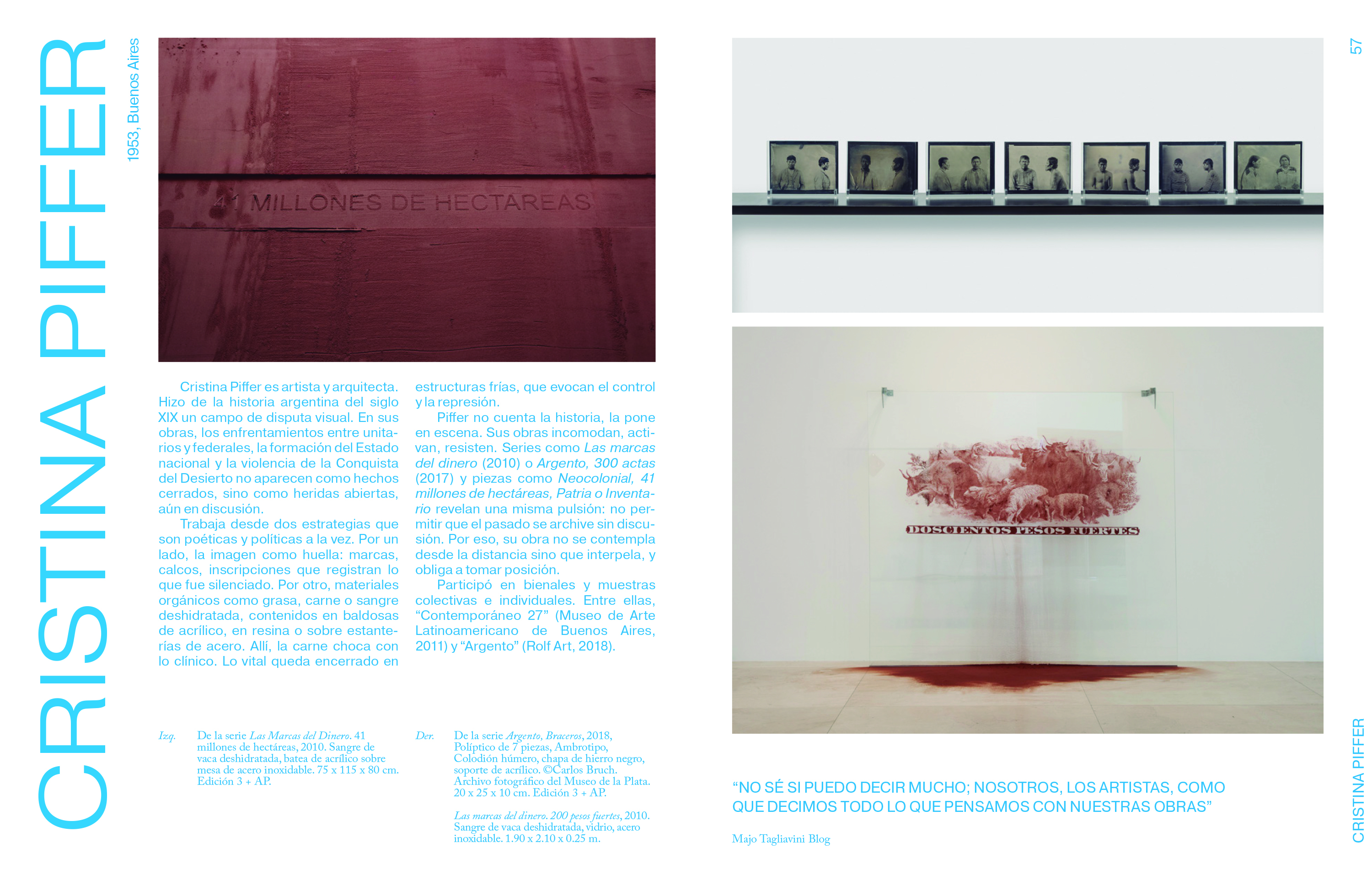 Son fotógrafas, pintoras, escultoras, performers, videoartistas, artistas textiles, bordadoras, dibujantes. Y son mucho más que cien, este es apenas un mero recopilatorio con ánimo de abrir una puerta al maravilloso mundo de las mujeres que hacen arte en la Argentina. Podríamos hacer varios tomos más, pero por algo hay que empezar.