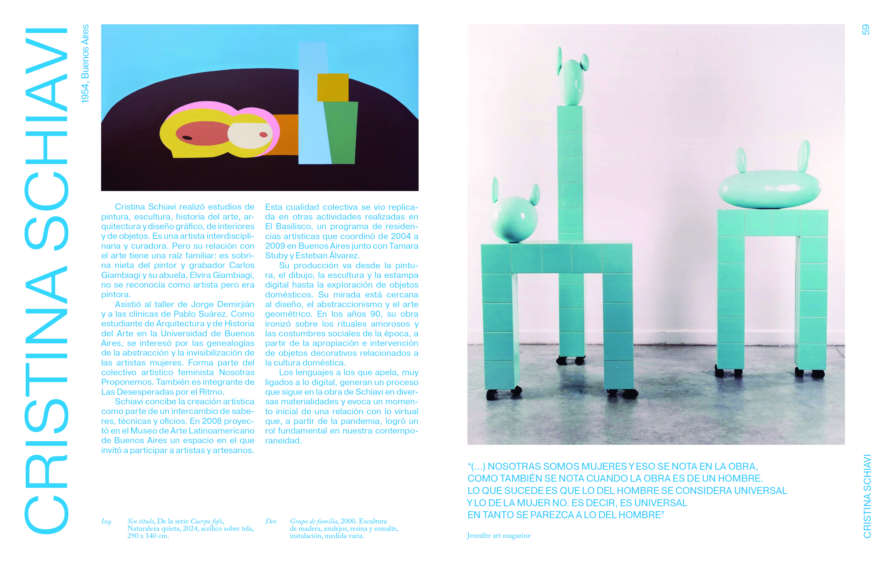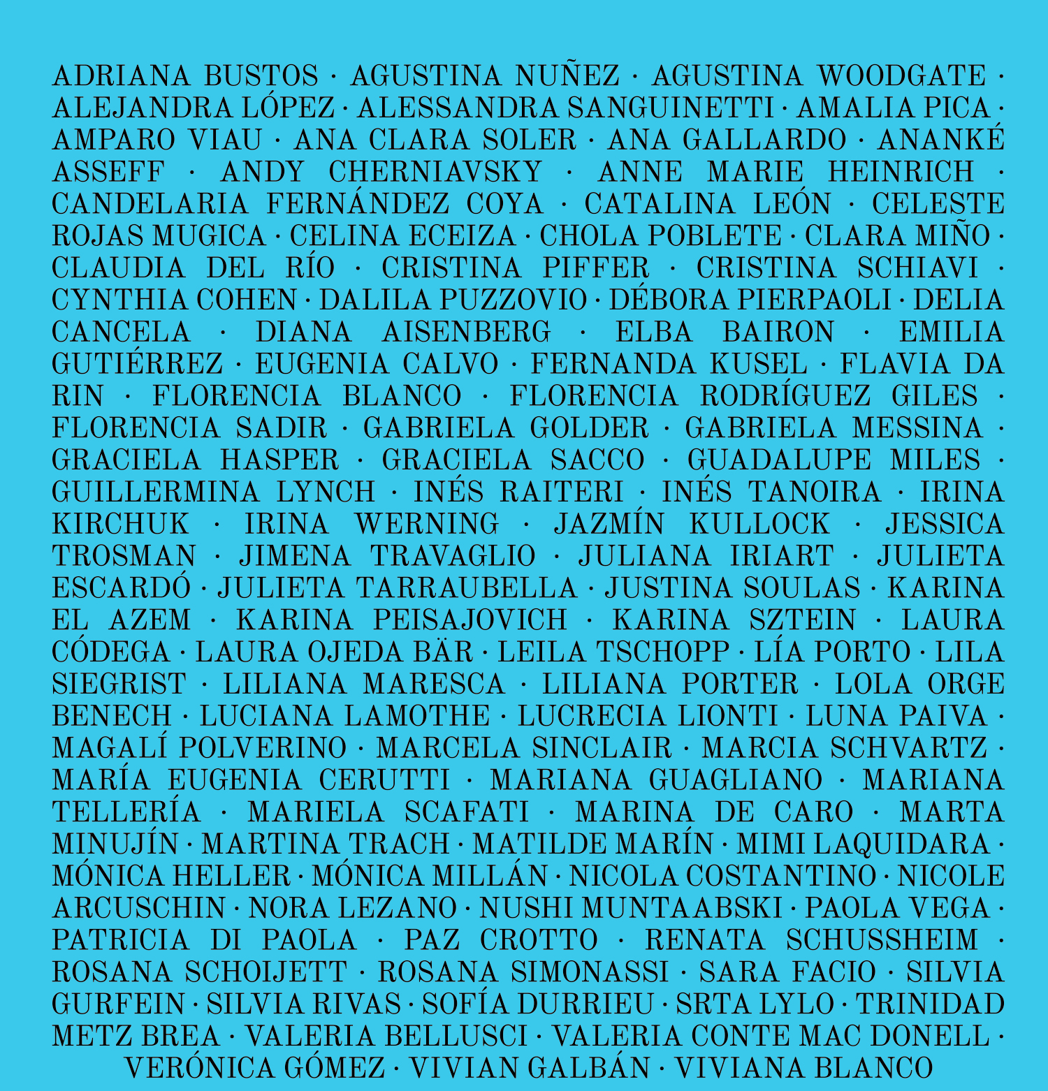 Van a encontrar a algunas de las más consagradas, como Liliana Porter, Liliana Maresca, Graciela Sacco, o las que nos representaron con sus participaciones en la Bienal de Venecia: Luciana Lamothe, Mariana Telleria, Mónica Heller. Pero también conocerán la obra de artistas argentinas que no tienen tanta visibilidad, que trabajan día a día en proyectos alucinantes, como María Eugenia Cerutti, Guadalupe Miles, Paz Crotto, Valeria Conte, Patricia Di Paola, Rosana Simonassi o Eugenia Calvo.